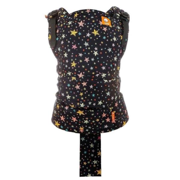 This Rainbow Stars Tula Half Buckle Baby Carrier is dark navy with colourful doodled stars all over and fits from newborn to toddler (7-45lb). This ergonomic baby carrier allows for supportive, comfortable babywearing with versatile Meh Dai style crossover tie straps.
